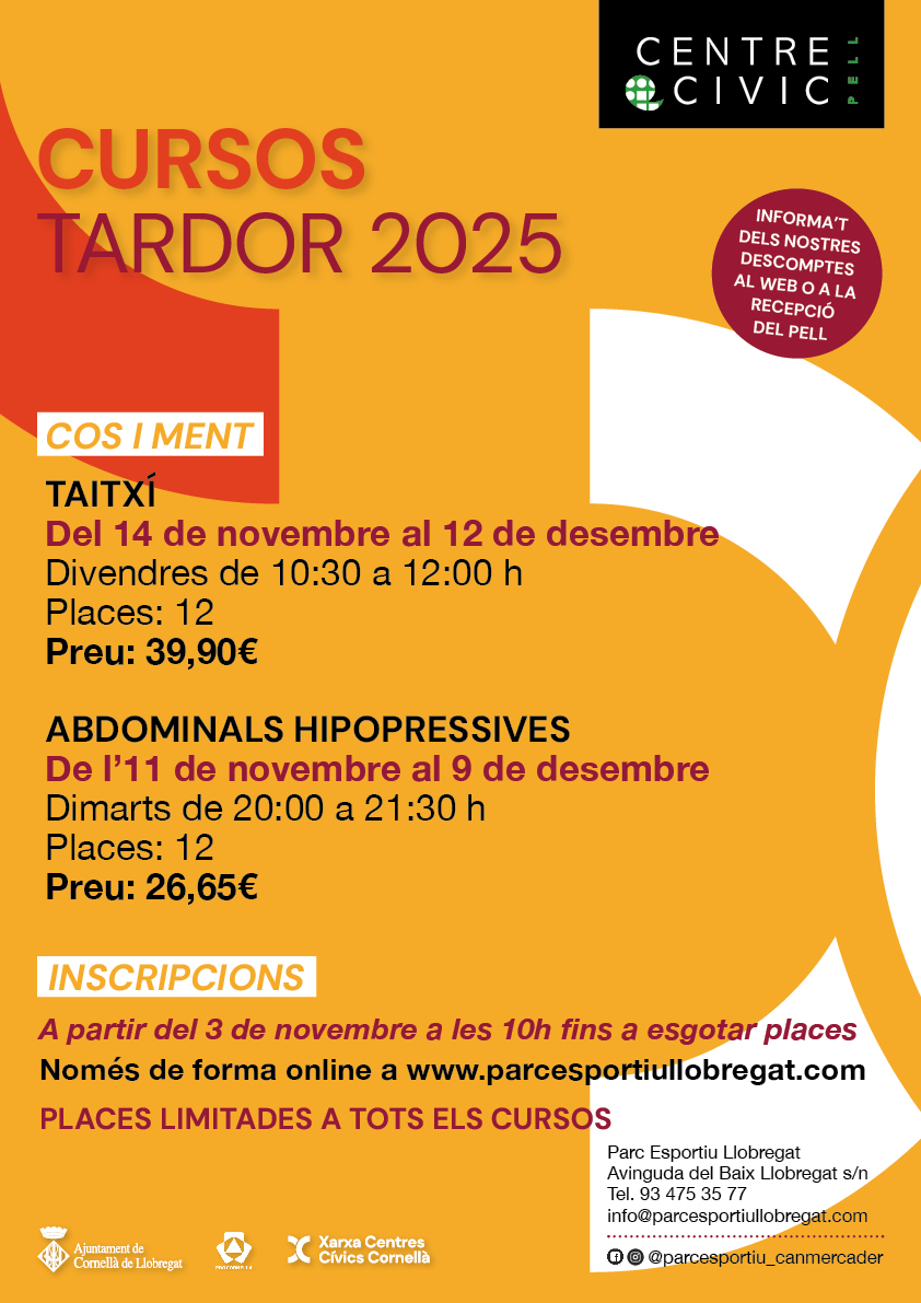 Se abren inscripciones de dos cursos, uno dedicado al Taitxí que tendrá lugar del 14 de noviembre al 12 de diciembre y otro para ejercitar abdominales hipopresivas que dará comienzo el 11 de noviembre y se prolongará hasta el 9 de diciembre.