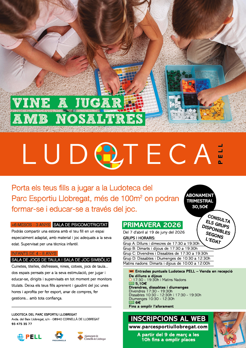 La Ludoteca del Parc Esportiu Llobregat cuenta con más de 100 m² diseñados para que los más pequeños puedan aprender y disfrutar del juego en un entorno seguro y estimulante, acompañados por familiares o guiados por nuestros técnicos especializados.