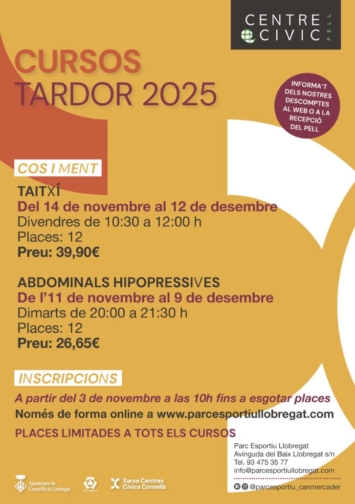 S’obren inscripcions de dos cursos: un dedicat al Taitxí, que tindrà lloc del 14 de novembre al 12 de desembre, i un altre per exercitar abdominals hipopressives, que començarà l’11 de novembre i es prolongarà fins al 9 de desembre.